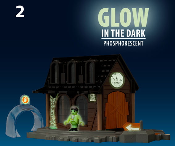 Отправьте локомотив Smart Tech 33971 (не входит в комплект) через сломанные двери и наблюдайте, как станция оживает с жуткими световыми и звуковыми эффектами. Затем для дополнительного элемента жуткости выключите свет, и станция вместе со своим призрачным проводником начнет светиться в темноте.