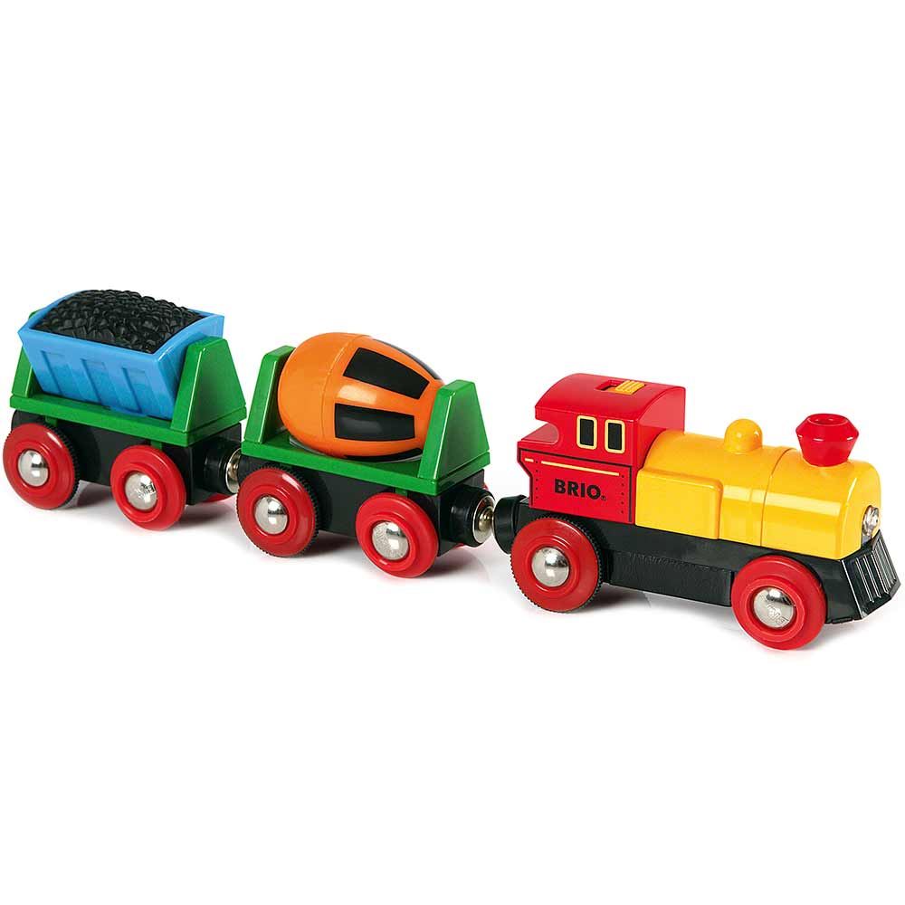 Набор состоит из паровоза, грузового вагона с углем, а также грузового вагона с бетономешалкой.