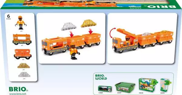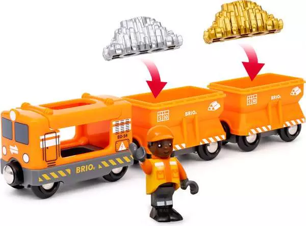 Перевозіть найцінніші вантажі за допомогою вантажного поїзда 36049. Цей помаранчевий іграшковий поїзд має два вантажні вагони, заповнені доверху золотом і сріблом. Відкрийте дах локомотива і посадіть машиніста на місце, перш ніж вирушити в дорогу. Цей іграшковий поїзд оснащений класичними магнітними зчепками BRIO і ідеально підходить до всіх наборів BRIO World з підйомно-вантажними вагонами та іншими іграшками, пов’язаними з вантажними перевезеннями.