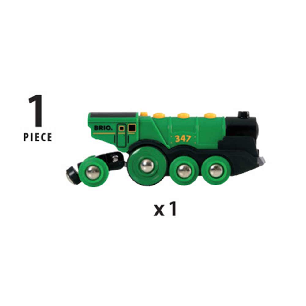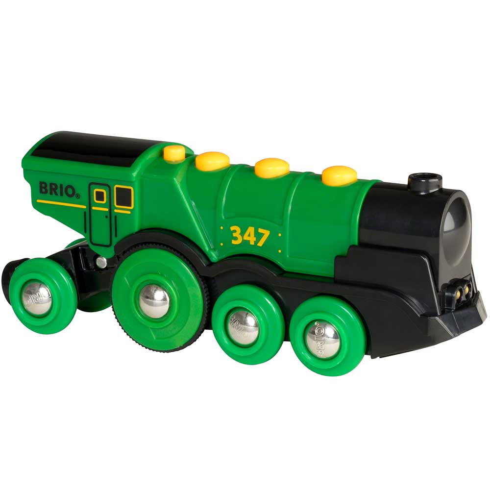 Локомотив зелений електричний BRIO 33593 приводиться в рух від 2-х батарейок, тип ААА. При русі горить фара і видається характерний звук поїзда.