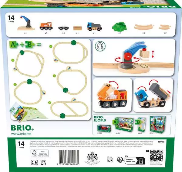 До складу набору дерев’яної залізниці BRIO (БРІО) входить залізничне полотно – конфігурація “овал”. Залізницею може їздити вантажний потяг, що складається з локомотива і вагона. На вагон, за допомогою підйомного крана з магнітною зчіпкою, можна завантажити вантаж. Після перевезення вантажу він може бути вивантажений на вантажний автомобіль-самоскид. У локомотива можна відкрити моторний відсік для “обслуговування”.
